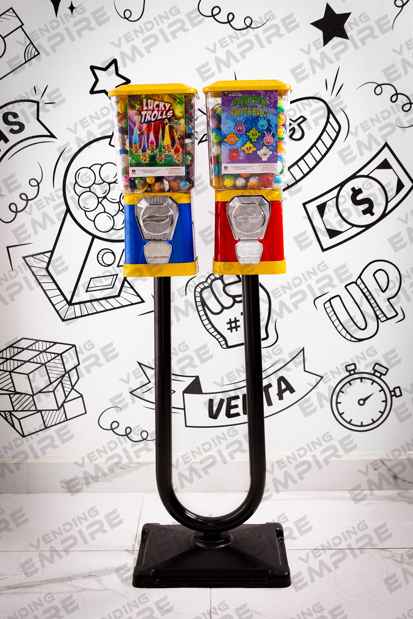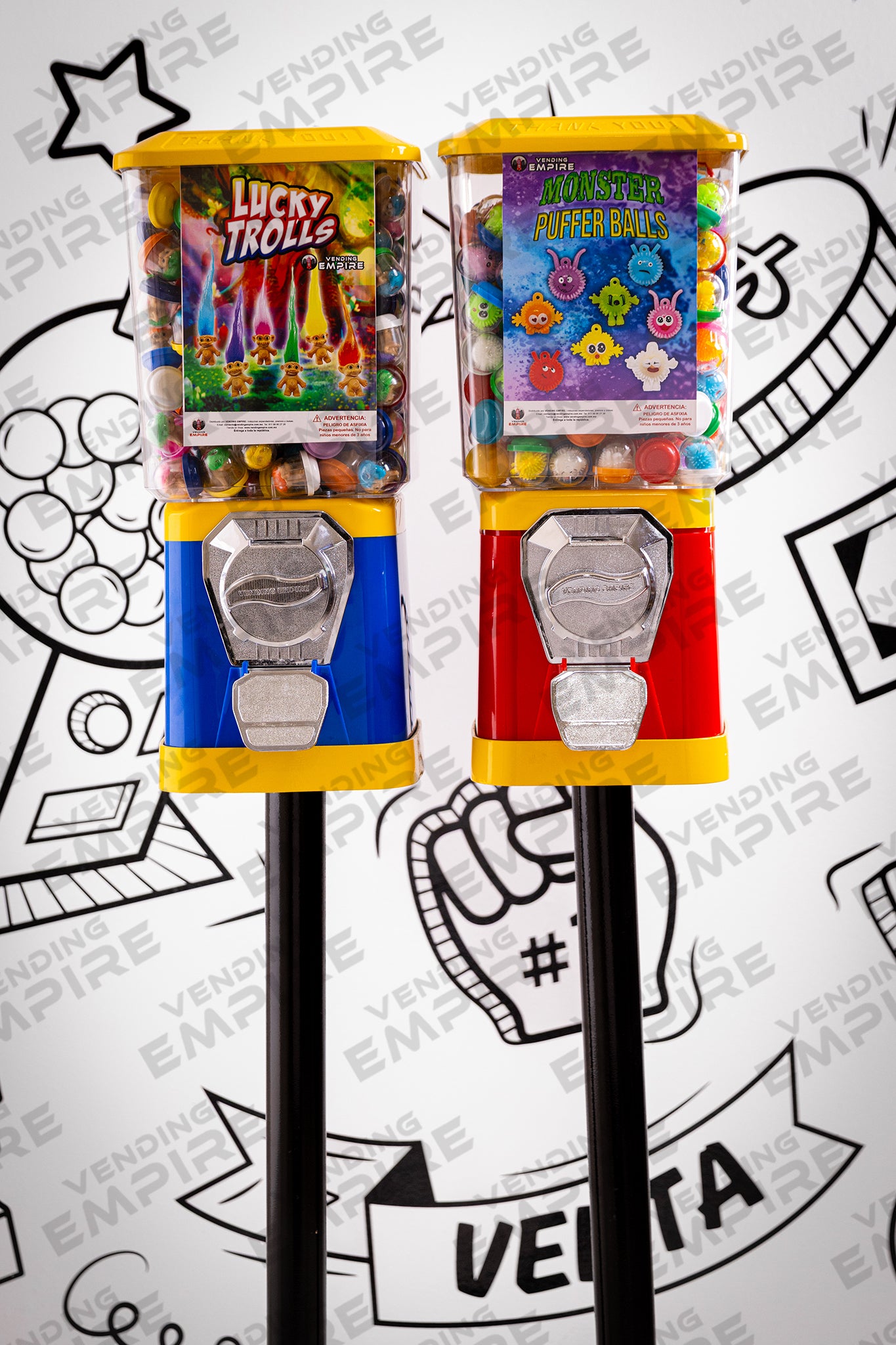 Incluye 2 Maquinas Clasicas Vending Empire capsuleras de 1 pulgada con monederos y colores de su eleccion.
