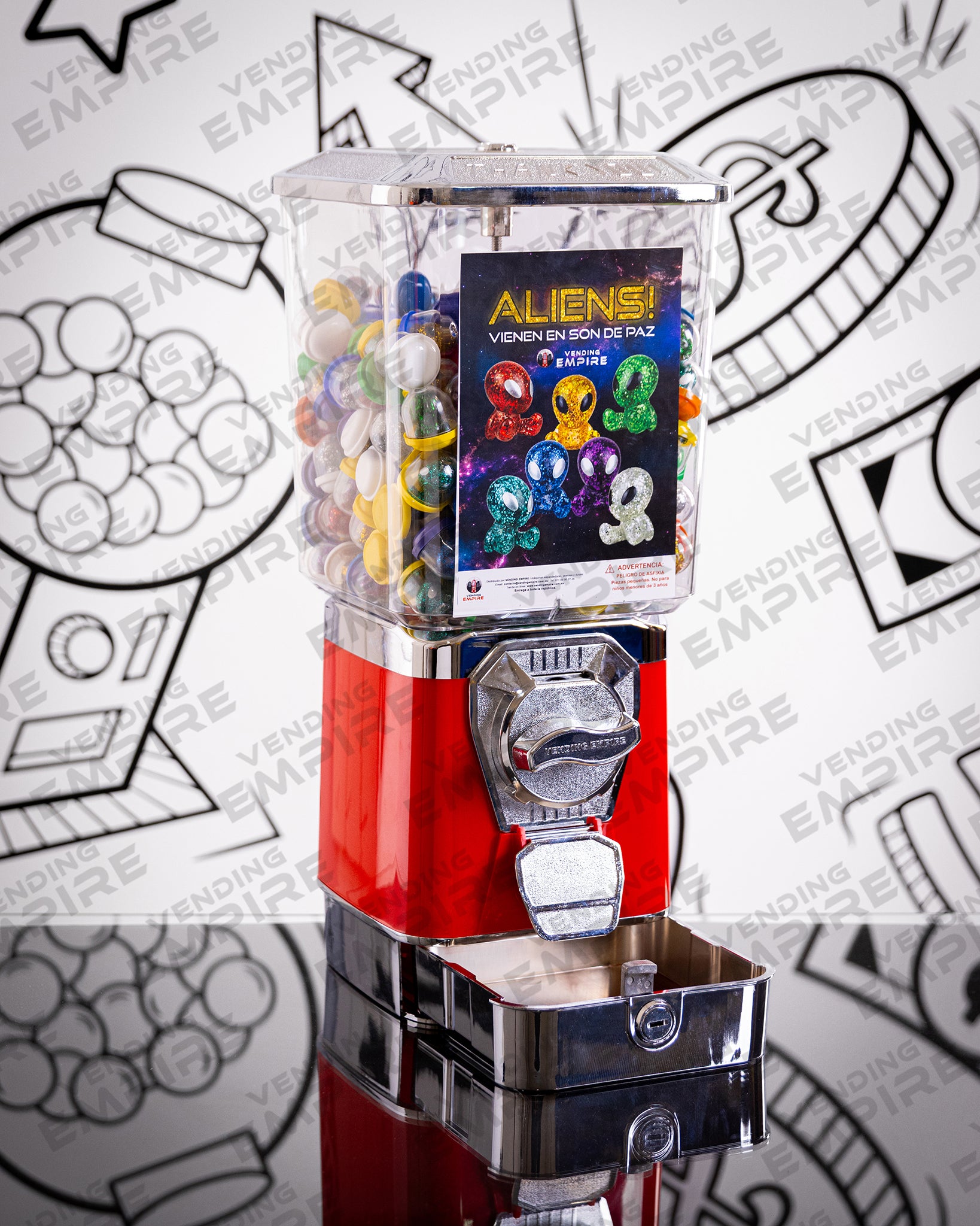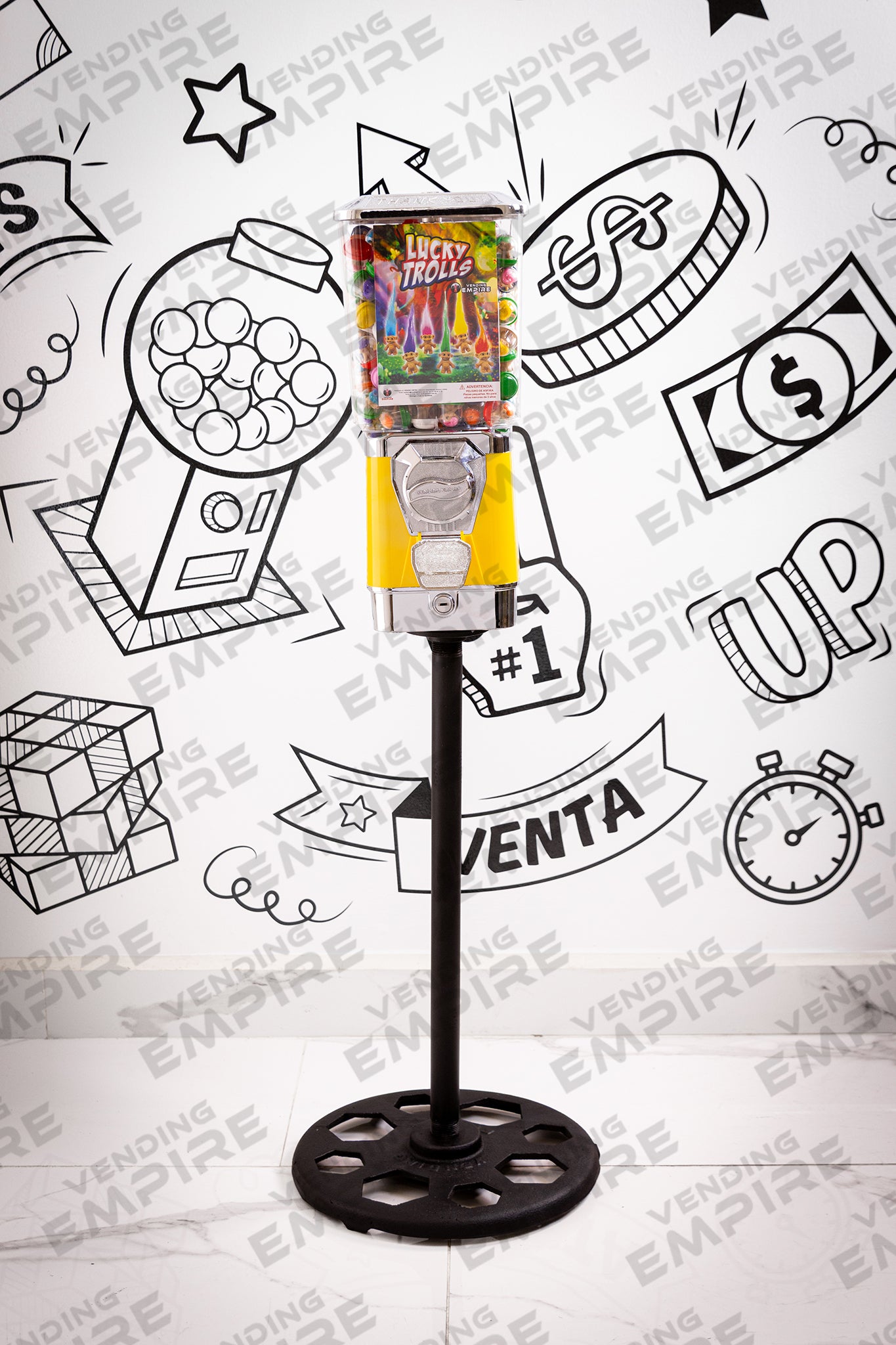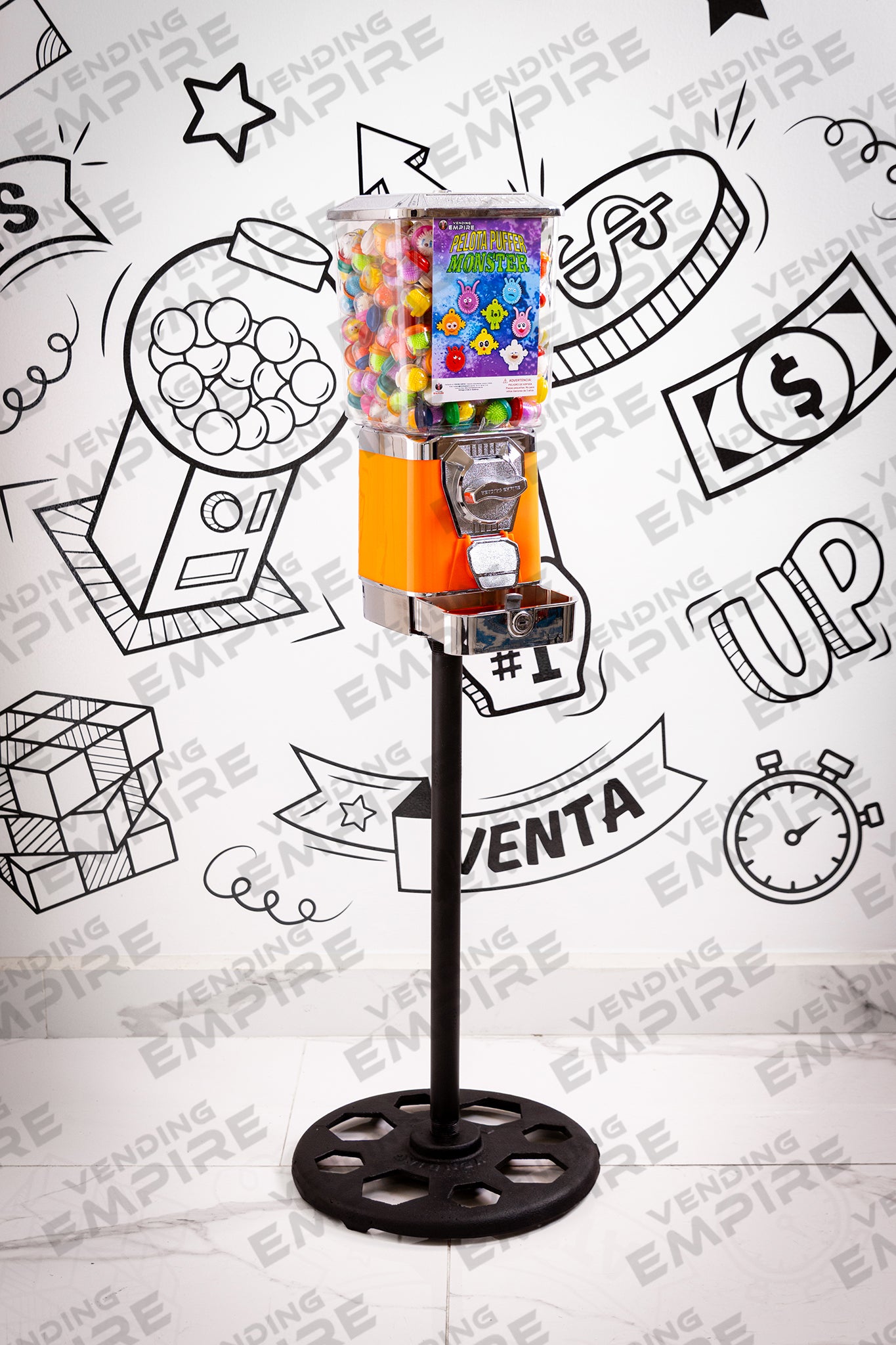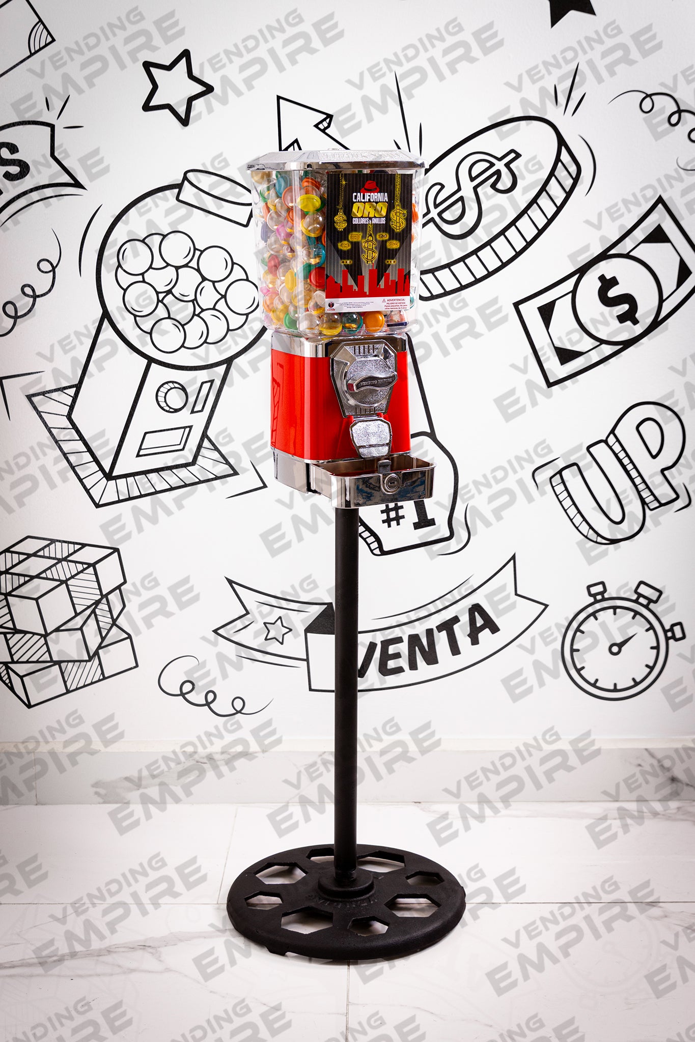 Maquina Expendedora Suprema Vending Empire con Pedestal Redondo Vending Empire, ideal para chicles o capsulas de juguete. Cuentan con caja recolectora de monedas para facilitar la recoleccion del dinero.