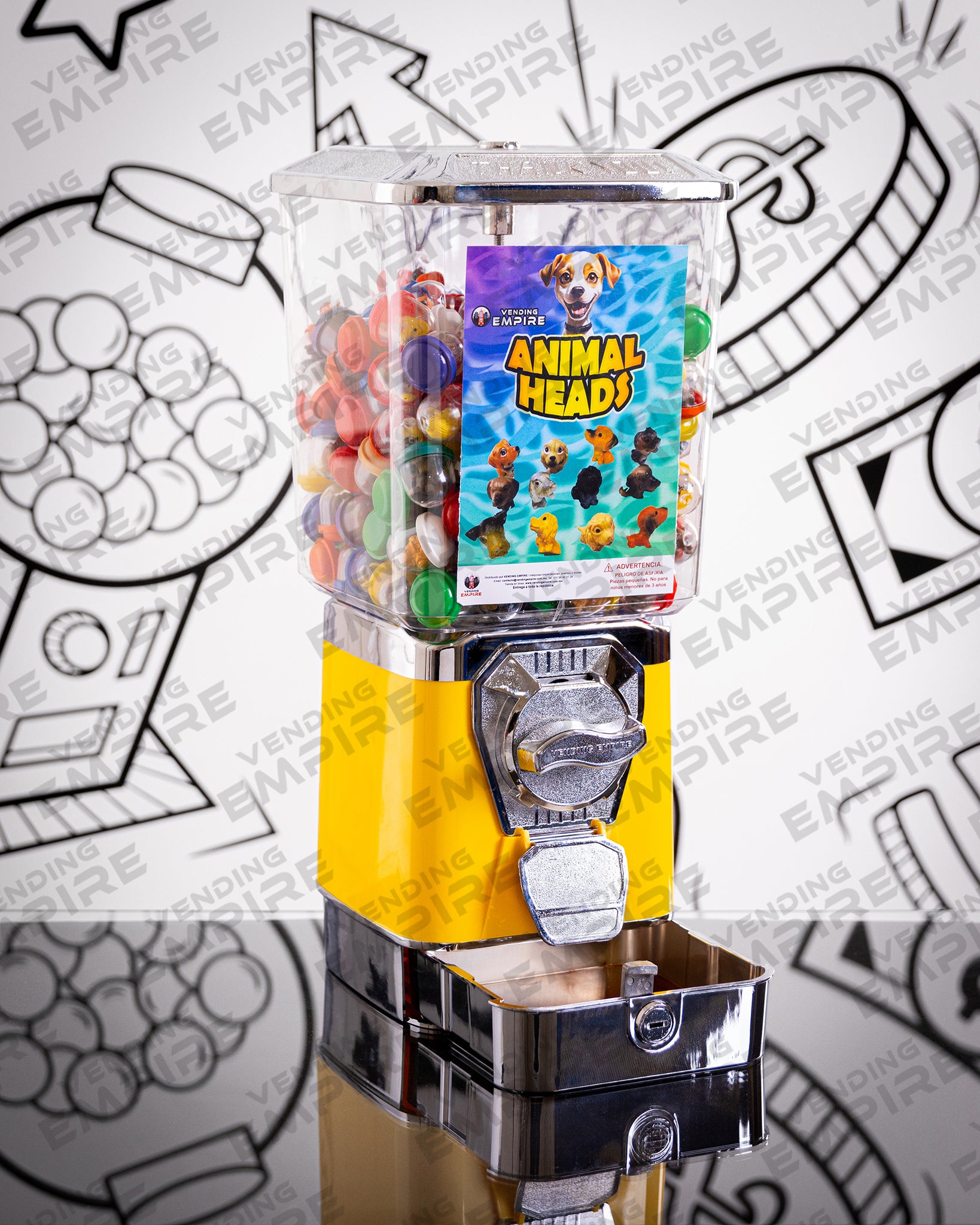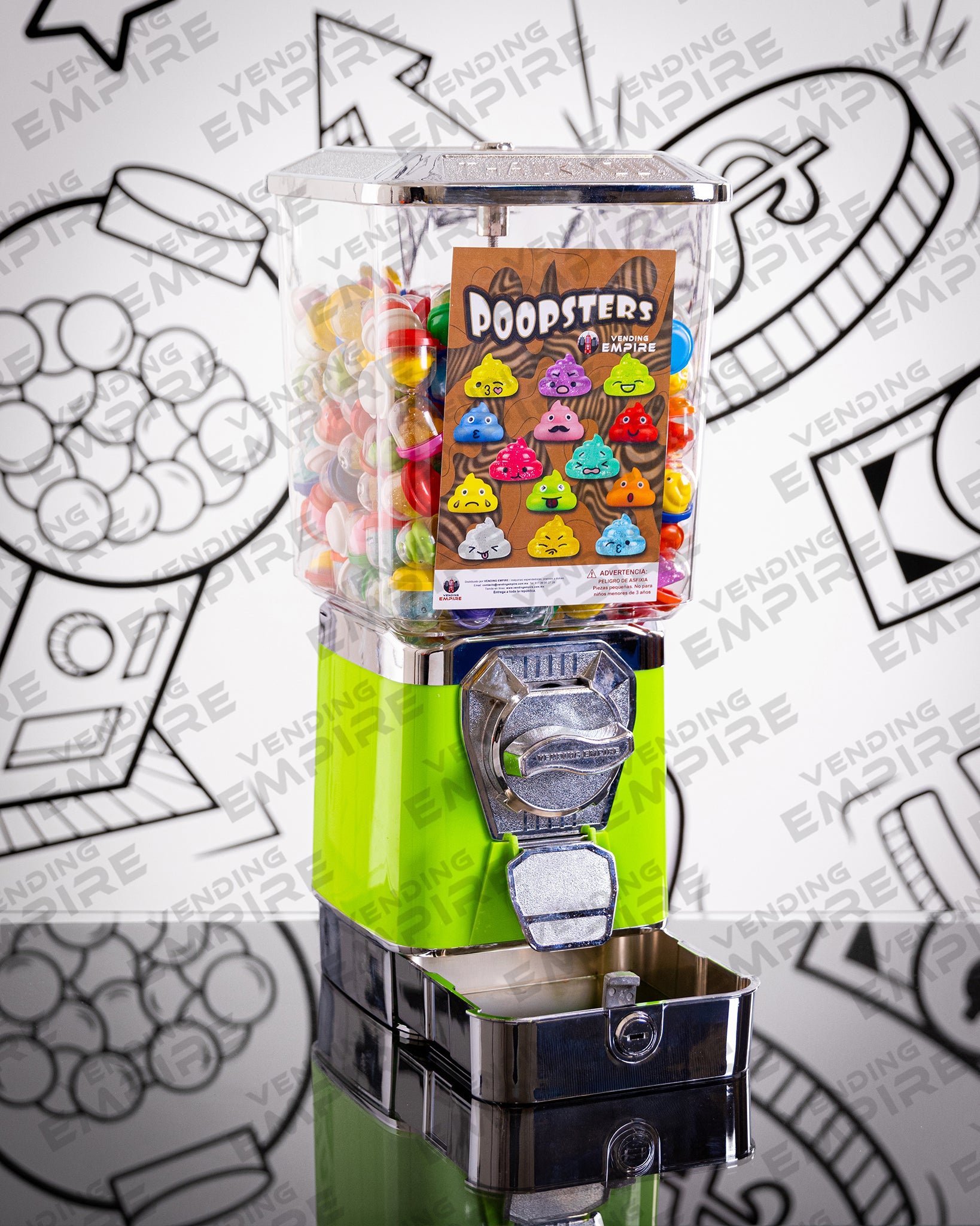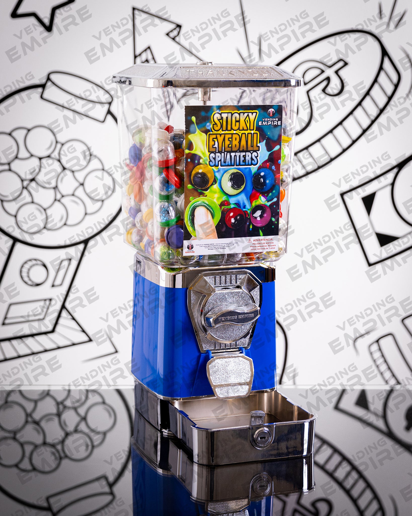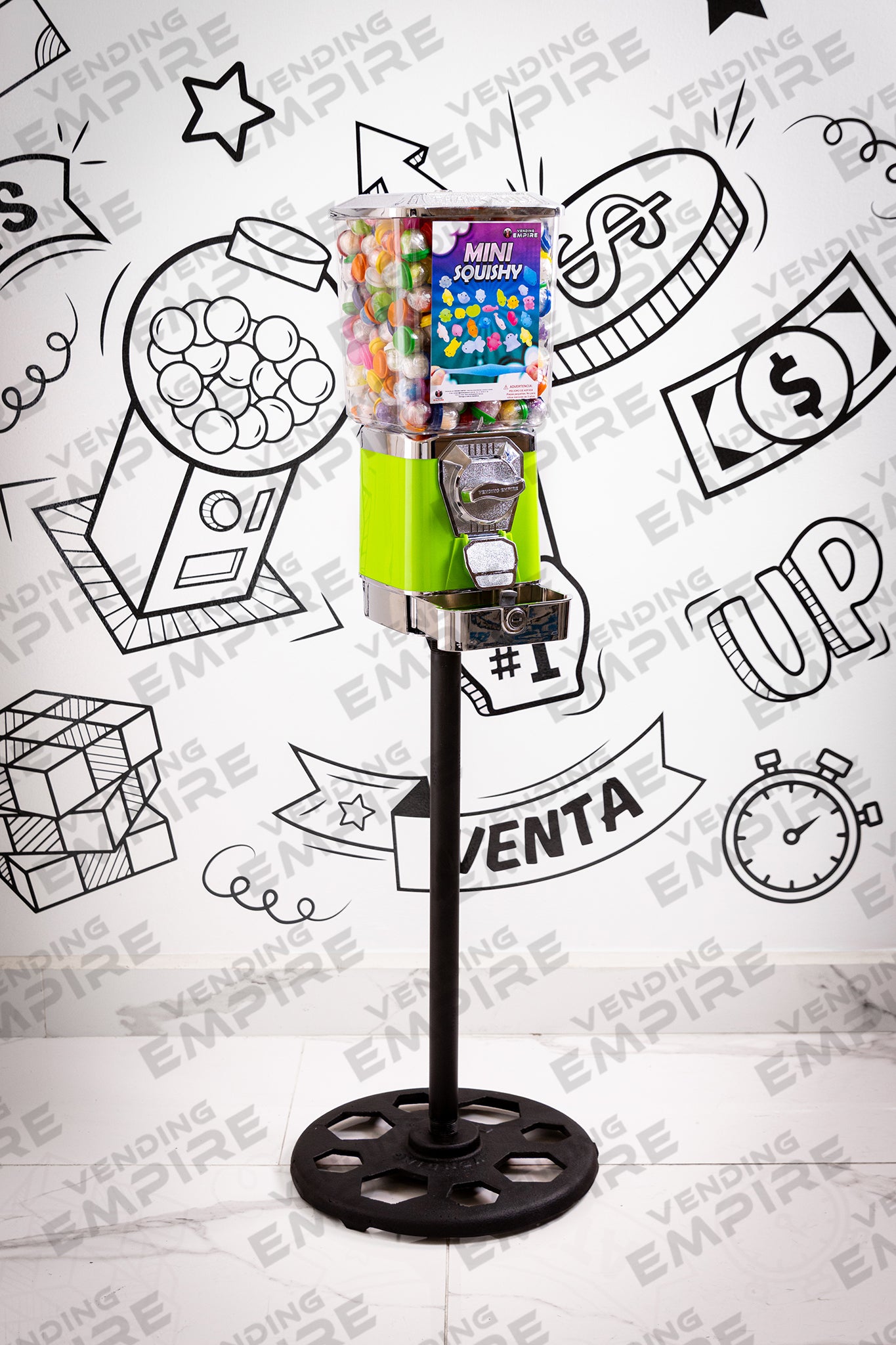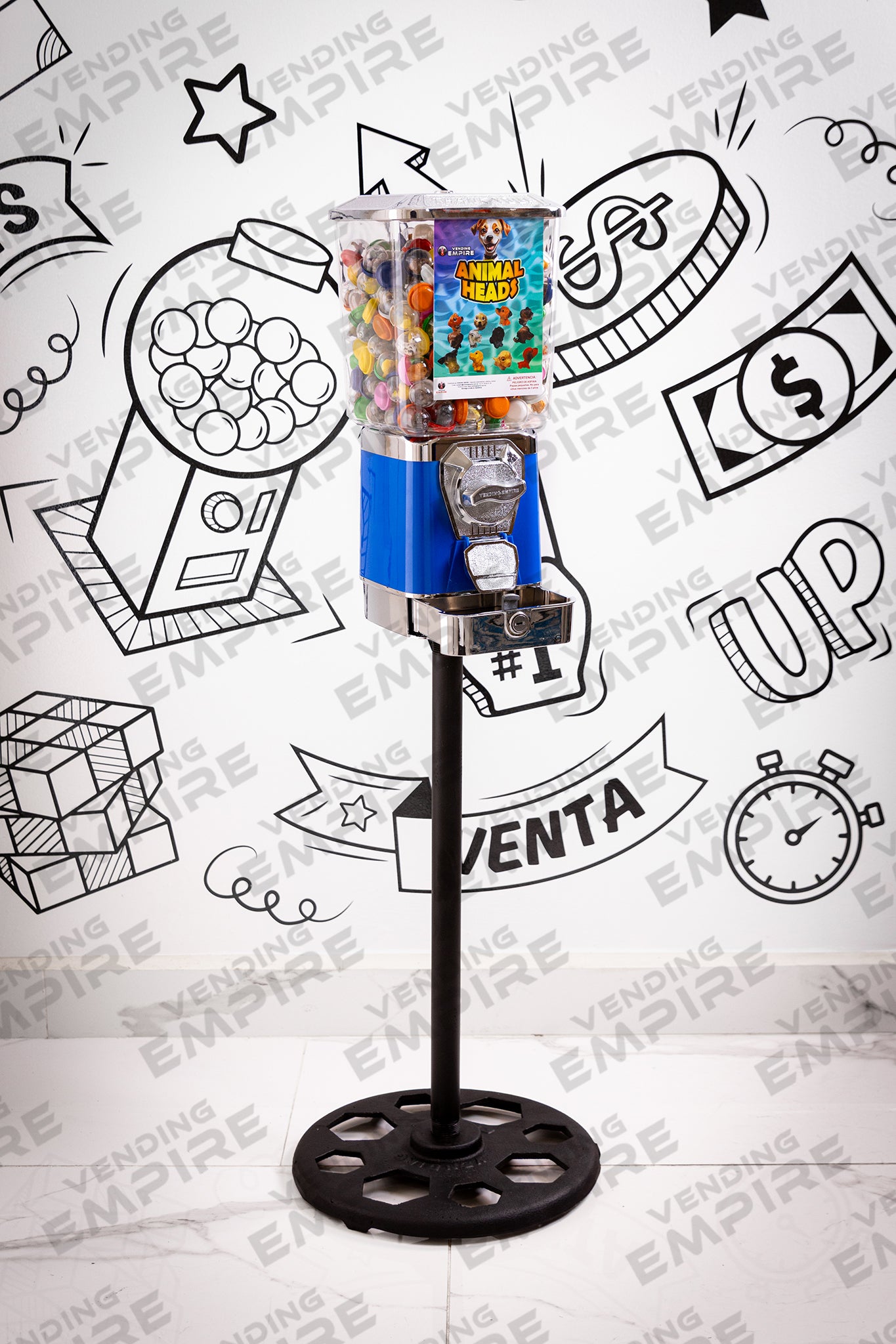 Maquina Expendedora Suprema Vending Empire con Pedestal Redondo Vending Empire, ideal para chicles o capsulas de juguete. Cuentan con caja recolectora de monedas para facilitar la recoleccion del dinero.